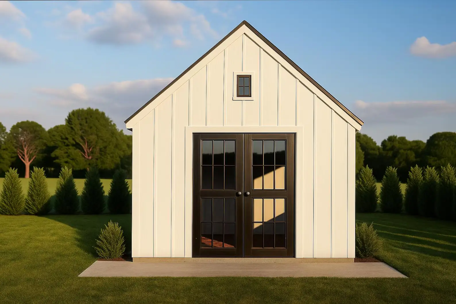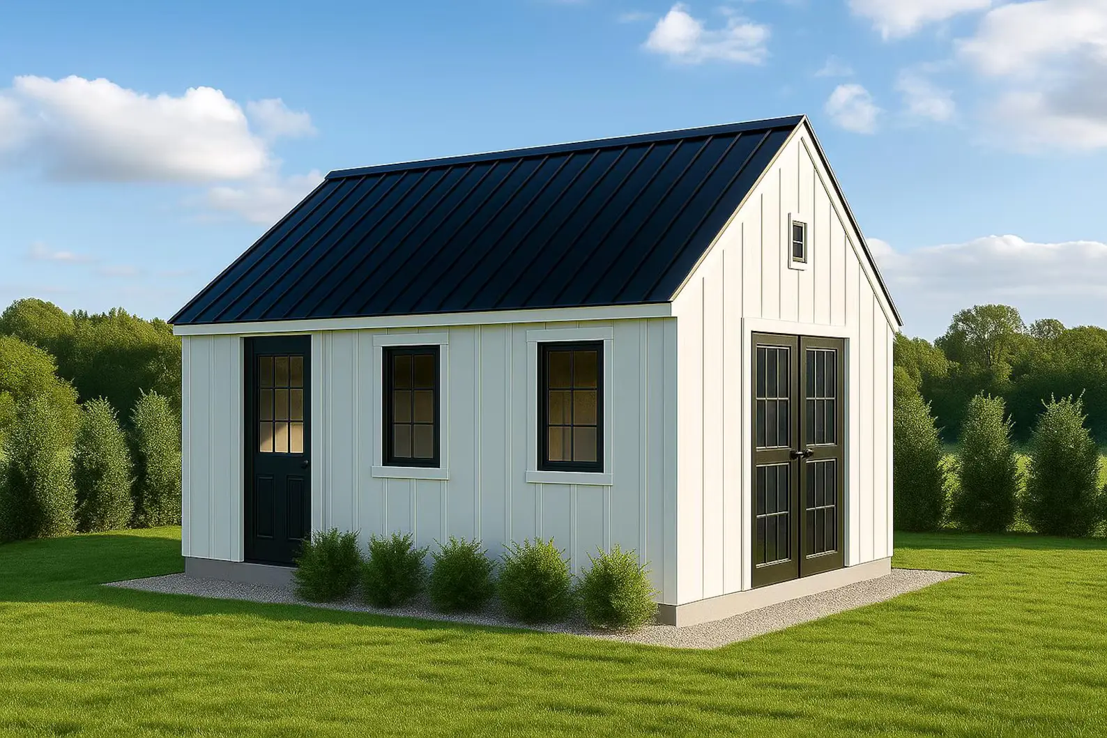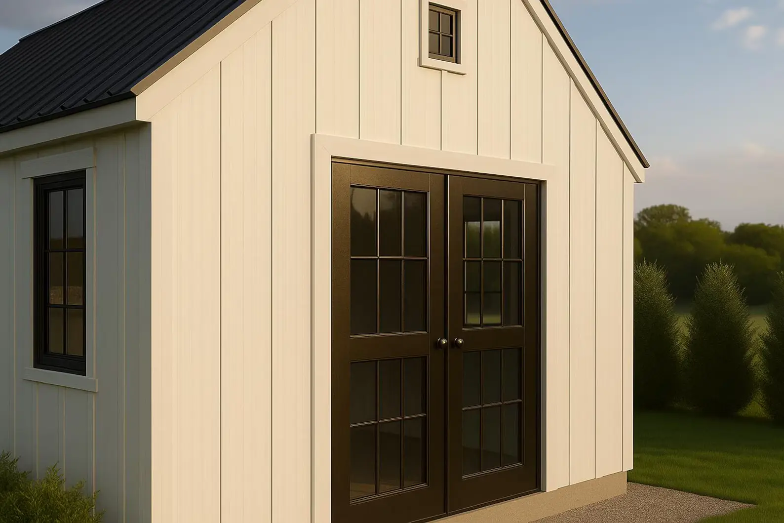 🎨 Siding & Trim – Features authentic board-and-batten siding using rough plywood with 1×2 battens. Includes trim details (1×6, Masonite, or cement board) for corners, doors, windows, and fascia.